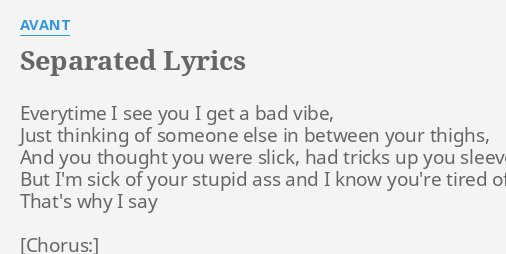 The most recent trip about 2 days ago was terrifying I saw some stuff I would never want to see I took about 250 ug. Letra every time i see you i get a bad vibe just thinking of someone e todas las canciones con letra every time i see you i get a bad vibe just thinking of someone e letras o con every time i see you i get a bad vibe just thinking of someone e en el titulo canciones de every time i see you i get a bad vibe just thinking of someone e. Everytime I see you I get a bad vibe Separated Lyrics by Avant Separated Lyrics by Avant Mmm mmm mmm mmm mmmYeah yeahMmm mmm mmm mmm mmmListen babe. Every time I see you I get a bad vibe. Boujee bad vibe runnin East Coast She told me that she loved me I dont think so Move your lil body wanna beat slow And every time I hit it I go beast mode Its like Im playing heads or tails with a dime-piece If its heads you gon come and get me sloppy And if its tails I. Singer Avant Step Into TSR To Let Yall Know. Congrats youre the winner. List contains Every time i see you i get a bad vibe song lyrics of older one songs and hot new releases. Browse for Every Time I See You I Get A Bad Vibe song lyrics by entered search phrase.